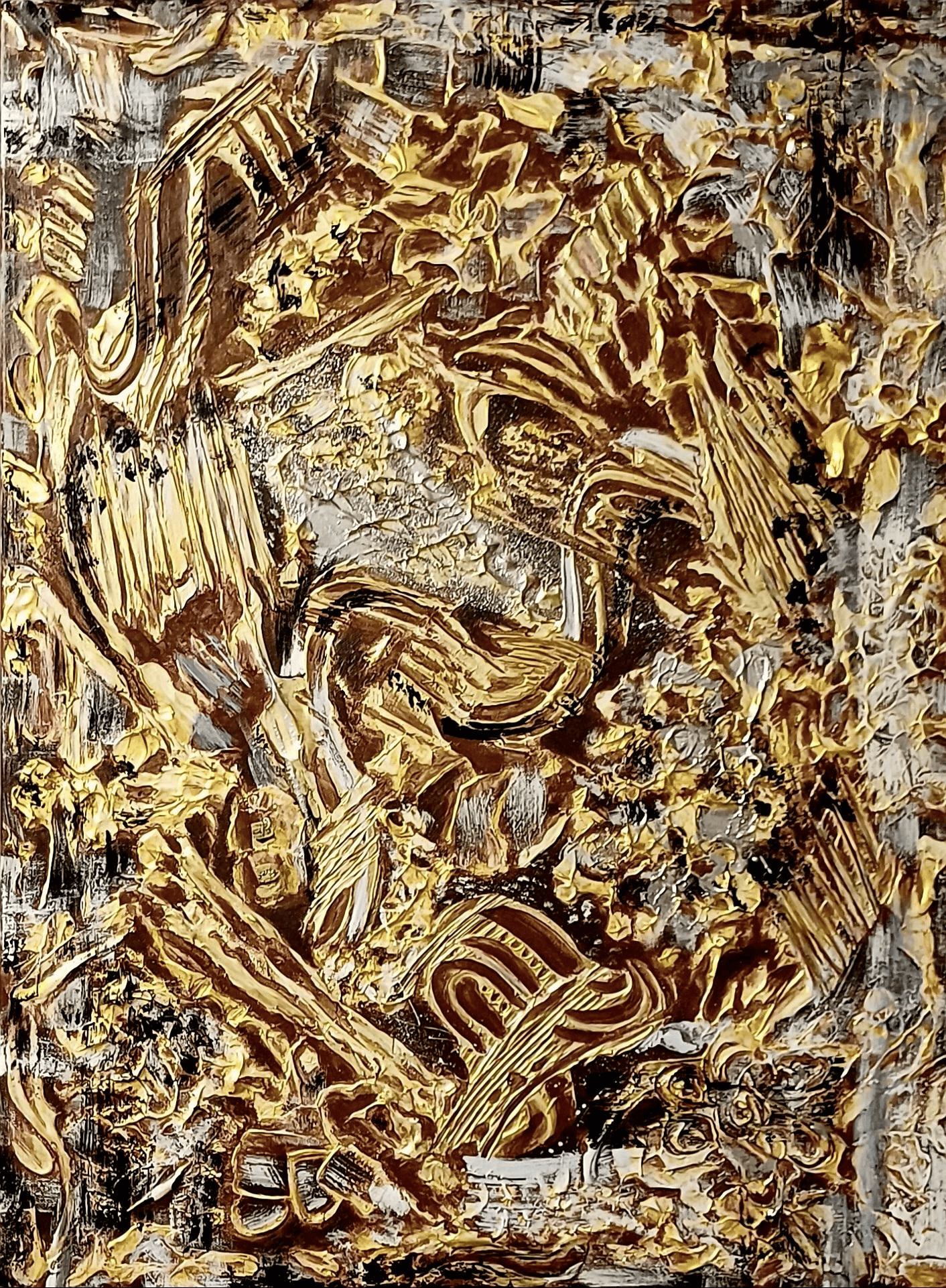 Использование текстурной пасты и акриловых красок создает уникальную поверхность, играющую с светом и тенью, что добавляет глубину и объем. Золотые и серебряные элементы придают работе ощущение роскоши и тепла, напоминая о том, что даже в самые трудные времена мы не одни — вокруг нас всегда есть свет и поддержка.